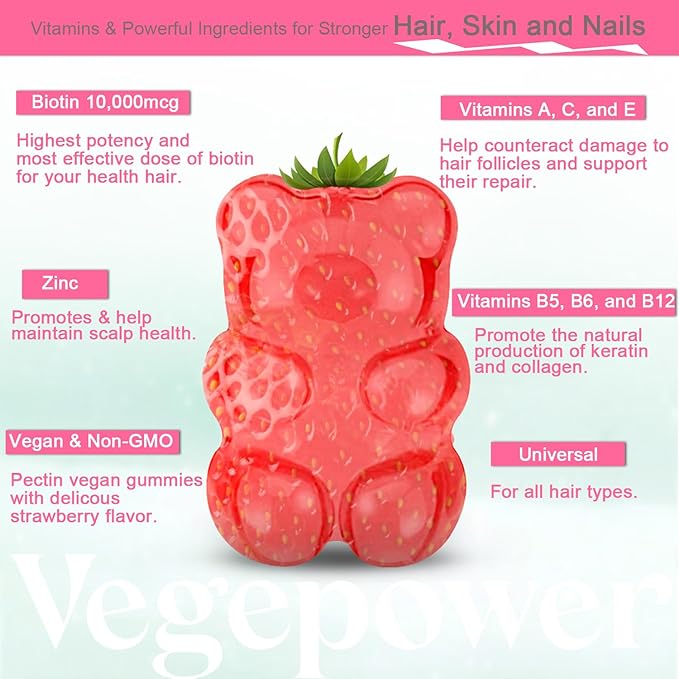 - 💅【Optimal FORMULA, More BENEFITS】These cute biotin hair growth vitamins gummies with biotin 10000mcg loaded with Vitamin A, C, D, E, B6, B12, B3, Folic Acid, Zinc, Pantothenic Acid, Iodine & coconut oil! Our ingredients were carefully put together for better performance to help for healthier hair, and nails. Vegepower Optimal formula hair growth vitamin allows you to exude your beauty from the inside out!