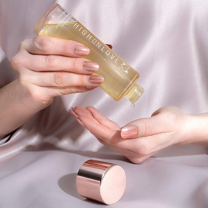 HIGHONLOVE Natural Body Oil with Hemp Seed, Grape Seed, & Vitamin E Oil - Moisturizing Body Glow with a Non-Greasy, Glowy Finish (120 ml) (Strawberries & Champagne)