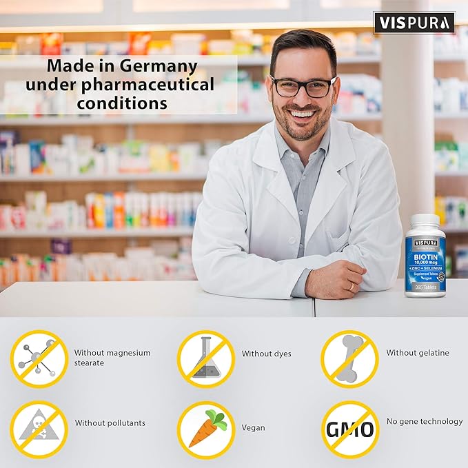 Biotin 10000 mcg + Zinc + Selenium, Pure, Vegan & Extra Strong, Best Supplement for Hair Growth, Glowing Skin, Strong Nails*, 365 Tablets for 12 Months, Natural Without Additives