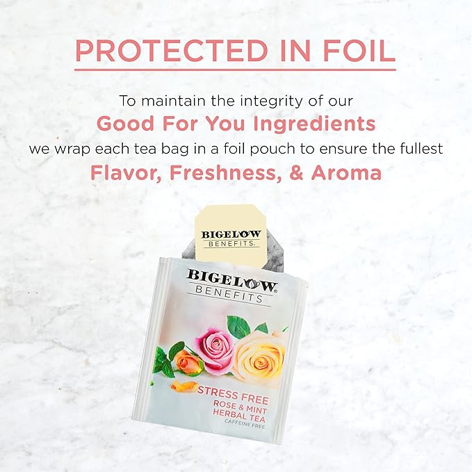 • Bigelow Benefits Rose & Mint Herbal Tea, Stress Free, Caffeine Free, Gluten Free & Non-GMO, 18 Tea Bags, 1.15 Oz (Pack of 6)