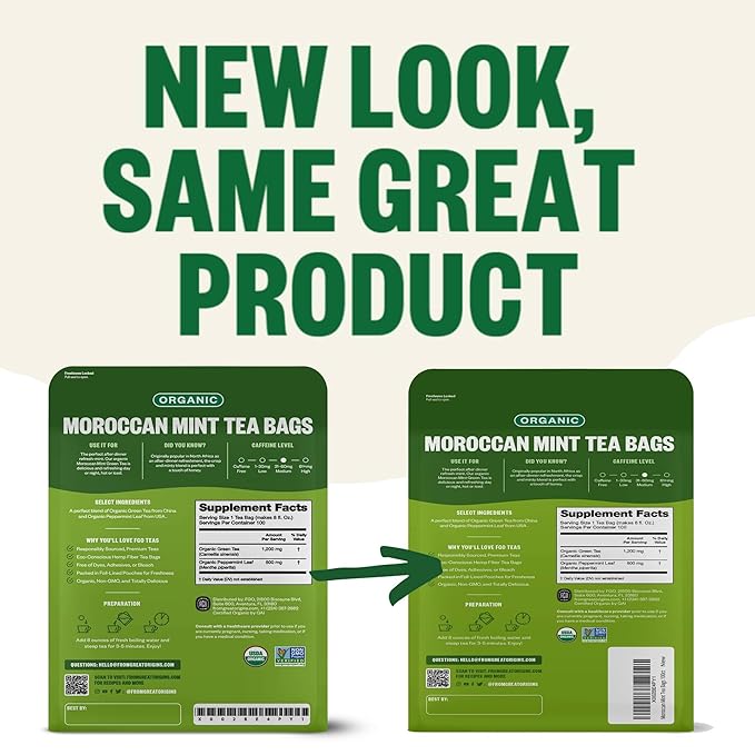 - ORGANIC MOROCCAN MINT TEA - The tea is filled into tea bags and packed into foil-lined kraft bags in California