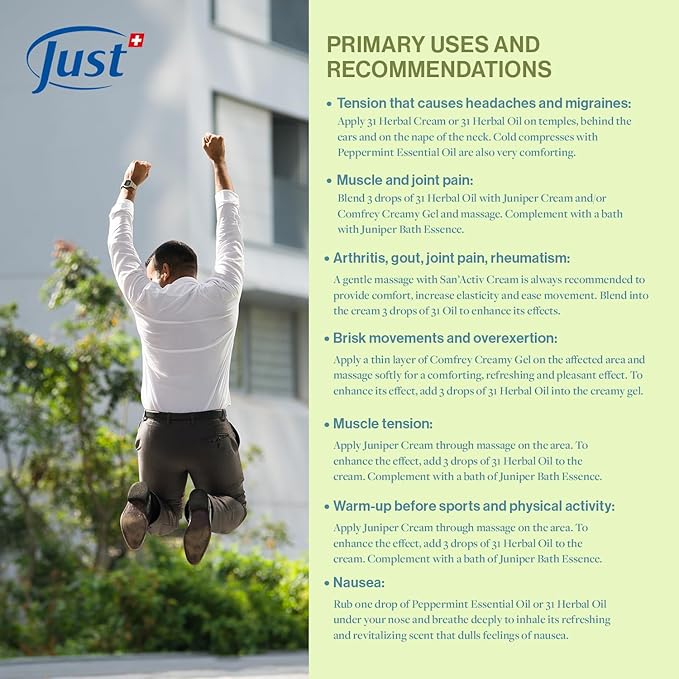 Essential Oil for The Whole Family. Swiss Just 31 Herbal Oil, Massage Oil for Muscle Soreness & Joint Pain. Contains Natural Eucalyptus Oil, 50ml.