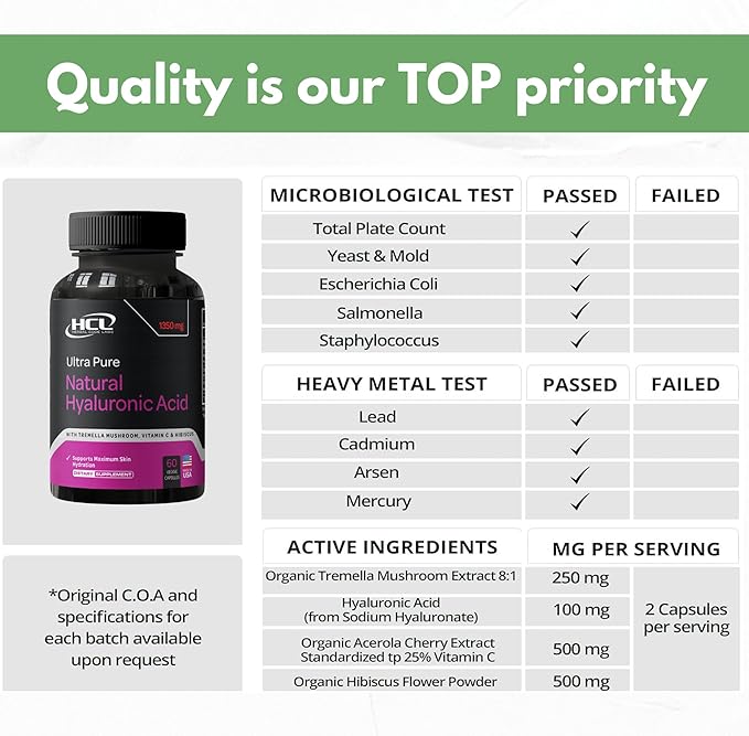 - MADE IN the USA, NO FILLERS, NO BINDERS, NO PRESERVATIVES, NON-GMO ✔ High quality is our #1 priority! Our best skin supplement does not contain any useless materials in “Other ingredients”. HCL skin vitamins has been formulated & manufactured in the FDA registered facilities under stringent GMP guidelines. Tested by third party lab to ensure highest levels of purity. SATISFIED WITH OUR PRODUCT OR 100% MONEY BACK!*