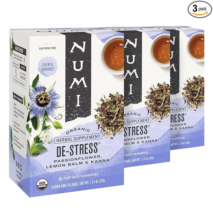 Numi Organic De-Stress Tea, 16 Tea Bags (Pack of 3), Passionflower, Lemon Balm, and Kanna, Caffeine Free