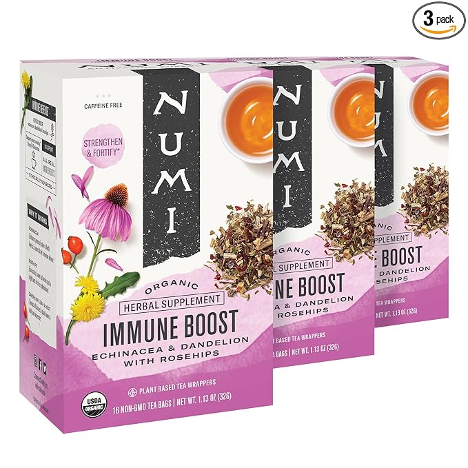 Numi Organic Immune Boost Tea, 16 Tea Bags (Pack of 3), Echinacea, Dandelion and Rosehips, Caffeine Free