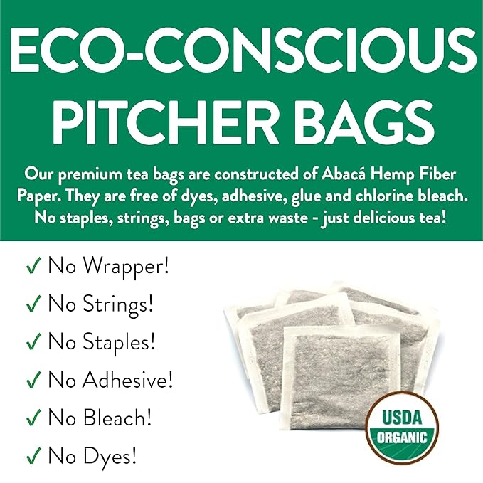 - 36 ECO-CONSCIOUS TEA BAGS - Our premium tea bags are constructed of Abacá Hemp Fiber Paper. They are free of dyes, adhesive, glue and chlorine bleach. No staples, strings, bags or extra waste - just delicious tea!