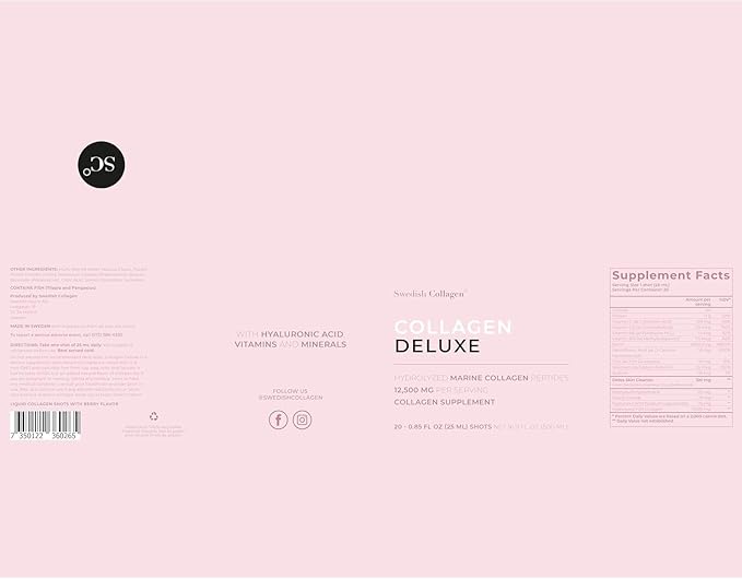 Swedish Collagen Deluxe | 12,500 mg Hydrolyzed Marine Collagen Liquid Supplement - 20 x 25 ml Daily Shots | Hyaluronic Acid, Biotin and Vitamin C for Healthy Hair, Skin, Nails and Joints | Sugar-Free