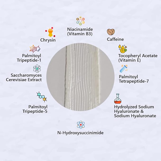 - Active Ingredients : Saccharomyces Cerevisiae Extract, Niacinamide (Vitamin B3), Caffeine, Hydrolyzed Sodium Hyaluronate (Hyaluronic Acid), Tocopheryl Acetate (Vitamin E), Allantoin, Sodium Hyaluronate (Hyaluronic Acid), Palmitoyl Tripeptide-5, Palmitoyl Tripeptide-1, Palmitoyl Tetrapeptide-7. Saccharomyces Cerevisiae Extract, Niacinamide (Vitamin B3), Caffeine, Hydrolyzed Sodium Hyaluronate (Hyaluronic Acid), Tocopheryl Acetate (Vitamin E), Allantoin, Sodium Hyaluronate (Hyaluronic Acid), Palmitoyl Tri… See more