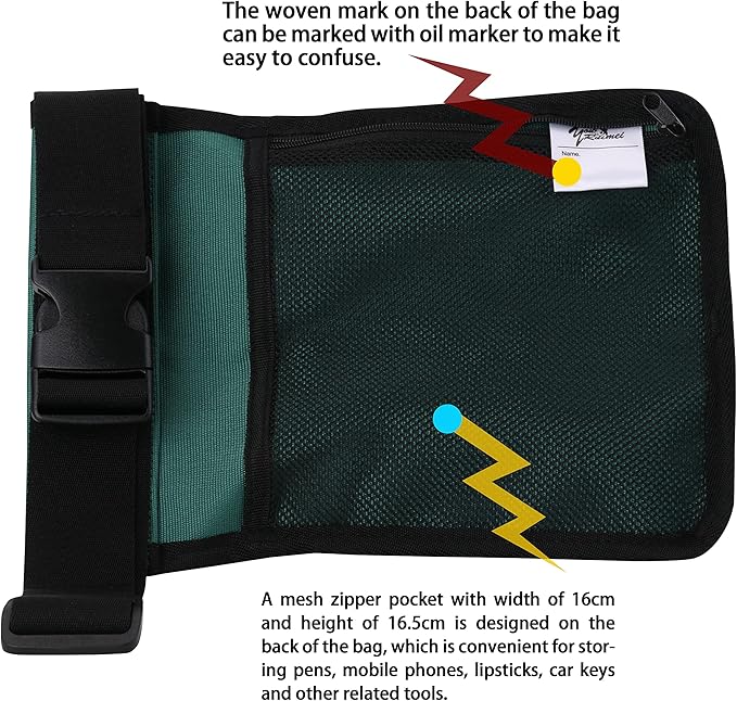 - 4. A 6.3-inch wide and 6.5-inch high zipper pocket is designed on the back of the bag, which is convenient for storing car keys, pens, lipsticks, mobile phones, and tools and materials related to small work tags. The woven logo on the back can be marked with your name and number for easy searching.
