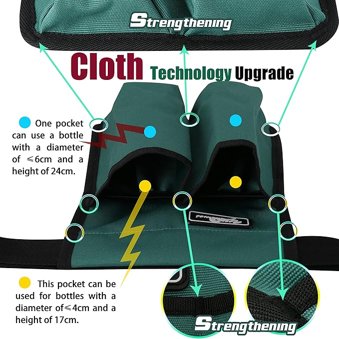 - 3. Design: * There are 5 pockets in the bag design. There are two large pockets and two small pockets on the front, which can be used for bottles of different capacities. The large pockets can be used for bottles with a diameter of ≤2.36inch 9.45inch; in addition, two small pockets. The pocket can hold bottles with a diameter ≤ 1.57 inches and a height of 6.69 inches;