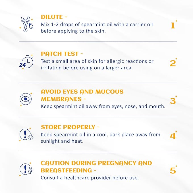 - Skin Care: Dilute 1-2 drops of spearmint essential oil in a carrier oil (such as almond oil), then apply the diluted oil to the skin and massage for a few minutes to improve your skin's texture