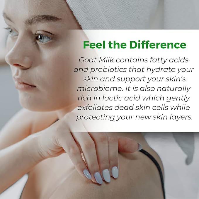 - THE SKIN BENEFITS OF GOAT MILK: Indulge in the luxurious benefits of goat milk for your skin. Packed with essential fatty acids and probiotics, it deeply nourishes and hydrates, fostering a vibrant skin microbiome. Its natural lactic acid content delicately exfoliates, revealing renewed layers of skin, while safeguarding against dryness.