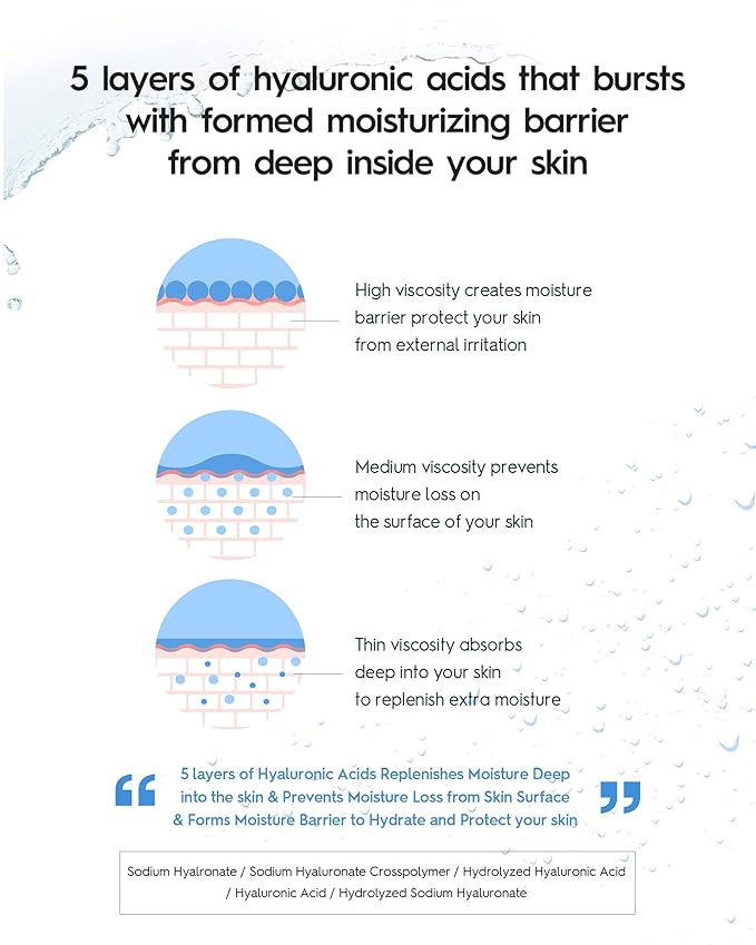 - 5 HYALURONIC ACIDS: 5 layers of hyaluronic acid replenishes moisture deep into the skin, prevents moisture loss from the skin surface, and forms a moisture barrier to hydrate and protect your skin.