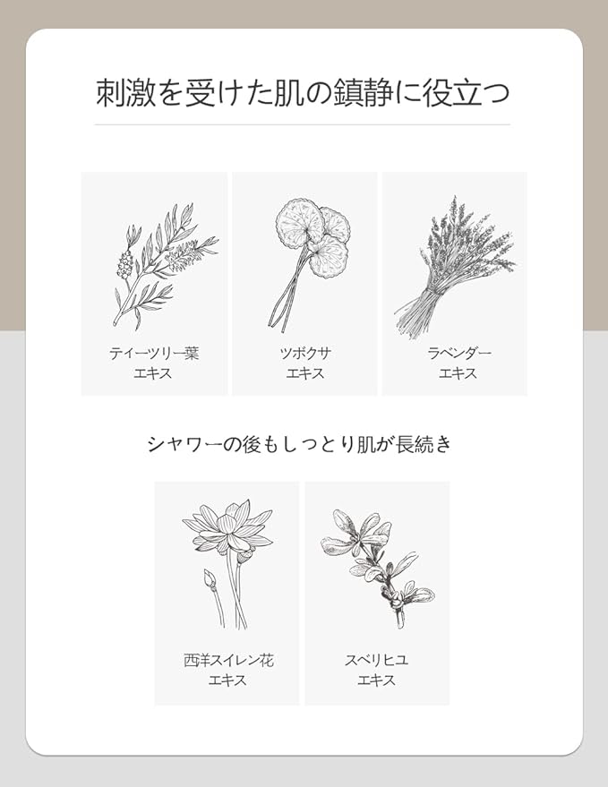 - FAST CALMING AND SOOTHING CARE - Through Tea Tree extract, Centella Asiatica extract and Lavender extract, the body lotion gives gentle and fast soothing and calming effects to the skin. Nymphaea Alba Flower extract and Portulaca Oleracea extract delivers moisturizing finish after cleansing for softer and smoother skin.