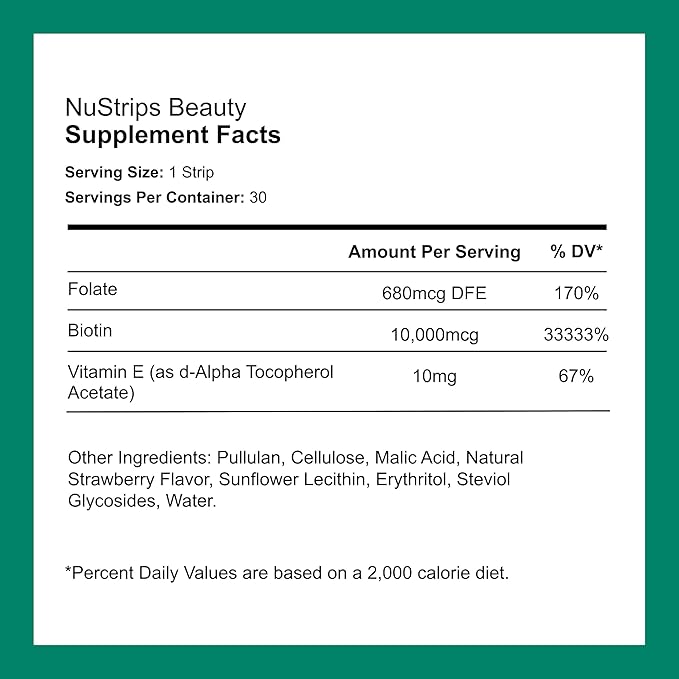 - Natural Beauty Booster: NuStrips Beauty in a Strip is formulated with essential beauty vitamins, including Biotin, Folate, and Vitamin E, to promote healthy hair, radiant skin, and strong nails