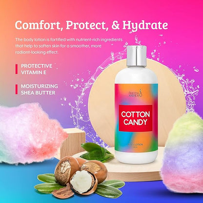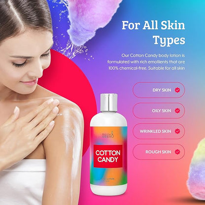 - Intense Hydration: Our Cotton Candy Deep Moisturizing Body Lotion is specially formulated to provide intense hydration. Infused with high-quality ingredients, it penetrates deeply into your skin, leaving it soft, supple, and rejuvenated.