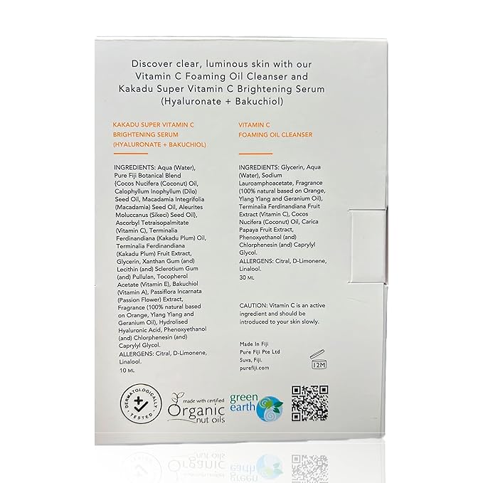 - Vitamin C Brightening Duo - Vitamin C Foaming oil (1 Fl.oz ) and Brightening Serum (0.33 Fl.oz), give skin an instant radiance boost while smoothing fine lines, balancing skin tone and boosting collagen.