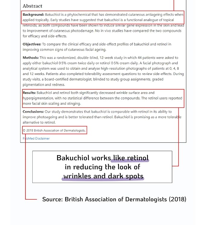 • Bakuchiol is a botanical retinol alternative extracted from the seed of Psoralea corylifolia L. It works similarly to wrinkles and pigmentation like retinol, it causes less stinging, burning, and itchiness. Unlike retinol, sensitive skin and pregnant women can use it, and it can be used both morning and night