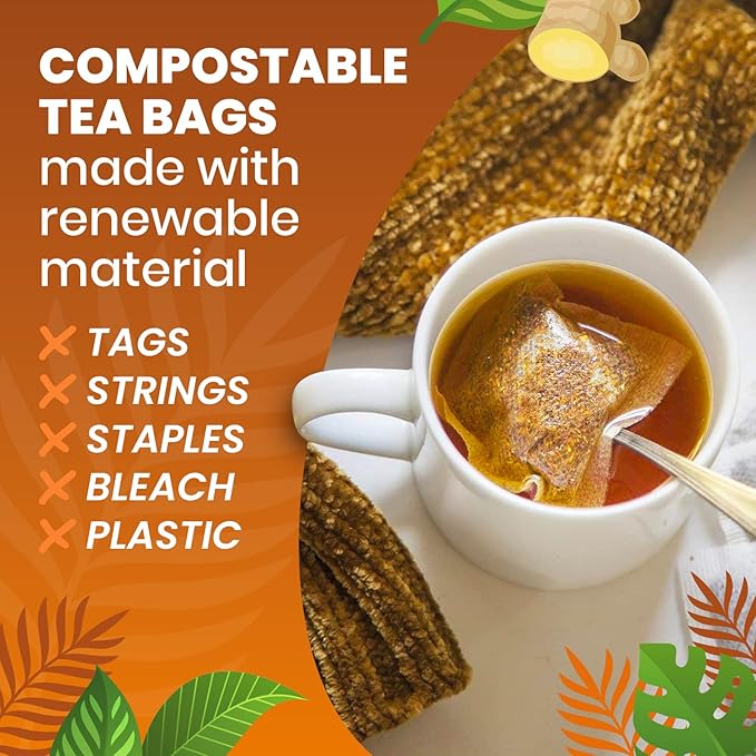 - All Taste, No Waste — Our organic tea bags are made of renewable acaba and cellulose fibers from sustainable plants. oxygen whitened, never bleached, and are free of glues and tags so they are completely compostable tea bags.