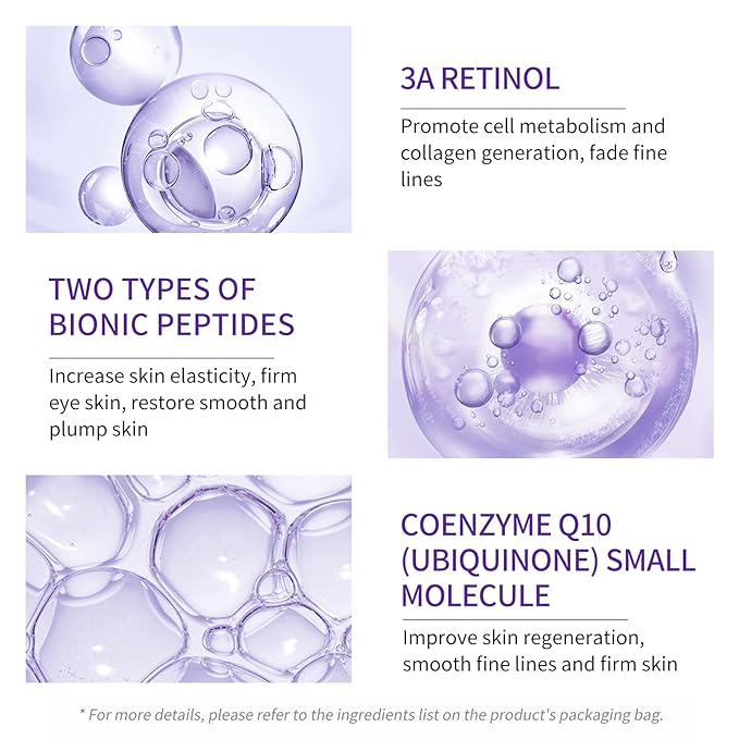 - 【Retinol Eye Cream】: Renewing Eye cream deeply hydrates, visibly smooths, firms, brightens delicate skin around eyes while helping restore the protective skin barrier. 3A Retinol promotes cell metabolism and collagen production reducing wrinkles. Two types of biomimetic peptides increase skin elasticity and firmness, and restore skin radiance and plumpness. CoenzymeQ10 (ubiquinone) small molecules promote skin regeneration, reduce wrinkles, and firm skin.