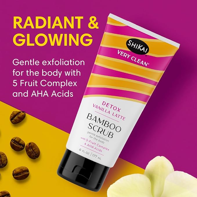 ShiKai Very Clean Bamboo Body Scrub (Detox Vanilla Latte, 6 oz) | Gentle Hydrating & Exfoliating Skin Cleanser | With 5 Fruit Complex & AHA Acids