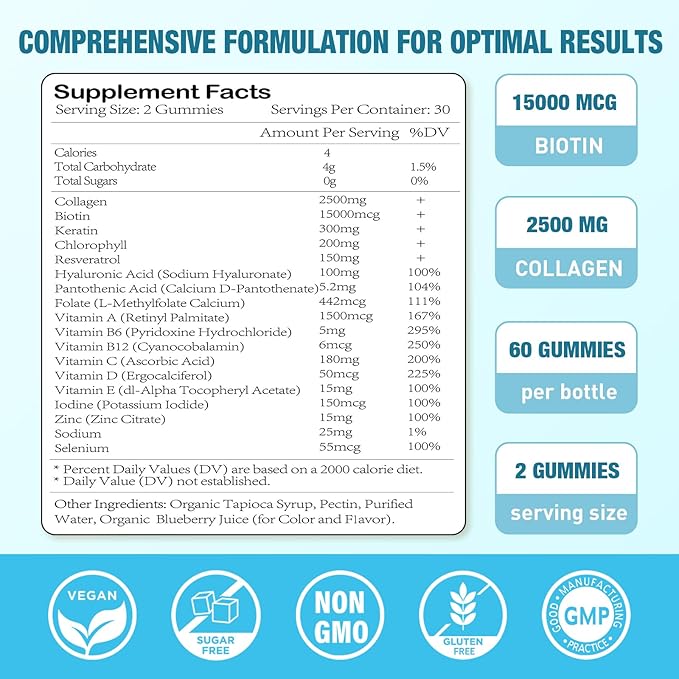 - Easy-to-Use: Each bottle of Biotin Gummies contains 60 gummies, with a suggested daily intake of 2 gummies. This user-friendly packaging ensures convenience and portability, facilitating on-the-go nutritional supplementation