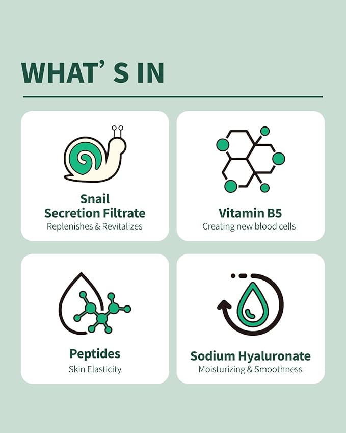 • Active Ingredients : Snail Mucus, Peptide, Hyaluronic Acid