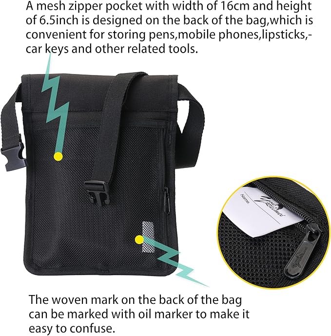 - 4.The back of the bag is designed with a mesh cloth pocket 2.75 inches wide and 6.5 inches high for easy storage of car keys, pens, lipsticks, cell phones, and tools and materials related to small work labels.