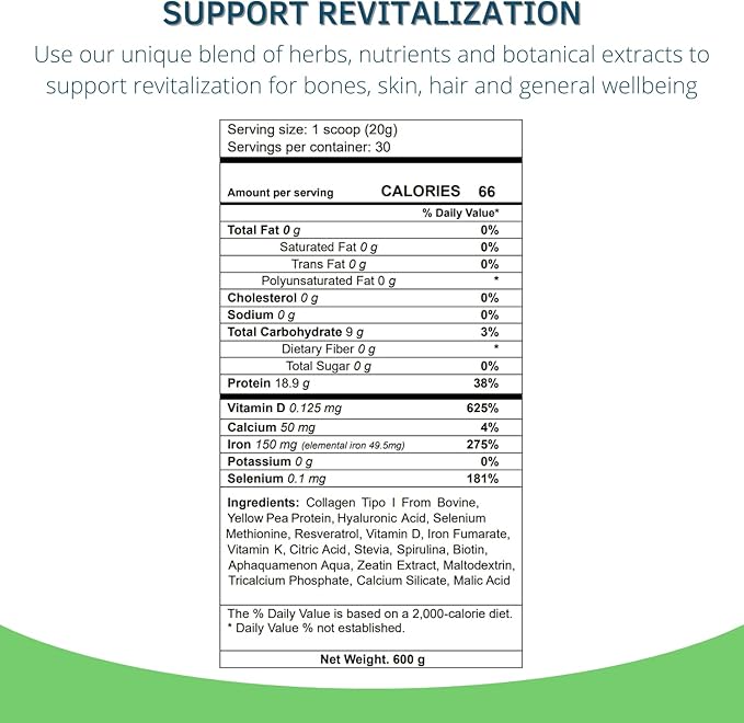 - BOVINE COLLAGEN TYPE I - A vital protein responsible for the elasticity of the skin, the structural integrity of bones, the flexibility of joints, and the connectivity of tissues.