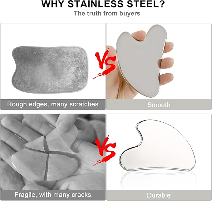 - 【Gua Sha Tool for Face】The Gua Sha massage tool and facial roller is made of high-quality stainless steel, polished to the mirror-like surface, massage tools are durable, smooth and easy to clean and provide sensitive support for massage.