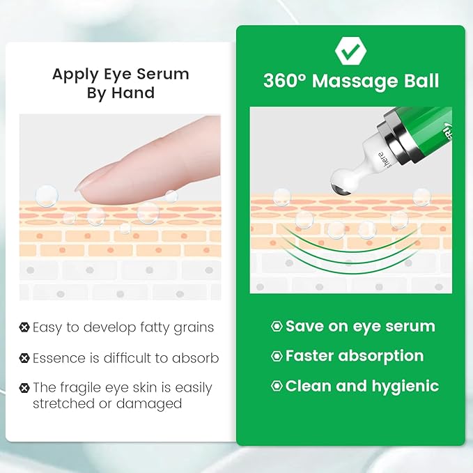 - 【UNDER EYE SERUM ROLLER】Under eye serum is designed with 360° cooling stainless steel roller-ball applicator, which works great when used in combination with our caffeine eye serum. can evenly distributes the eye serum around the eye comprehensive massage of the eye contour.