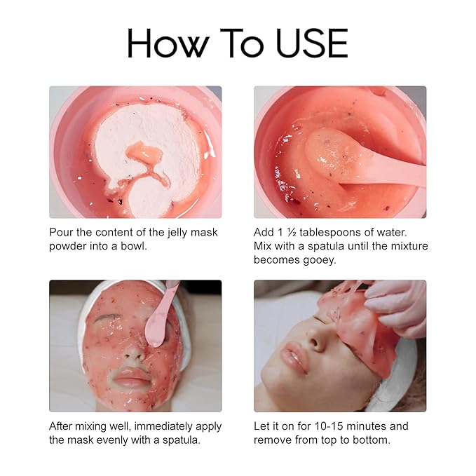 - 【HOW TO USE JELLY MASK POWDER】- Mix the mask powder and water in a bowl in a 1:2 ratio until combined. When you mix the mask powder, use half the amount of water, then add a little bit at a time to get the right consistency. It needs to be thicker than you think to avoid a drippy mess. Then use a spatula to apply the mask to your face or other areas of your body, then wait 10-15 minutes for the jelly mask to set. Finally peel off the mask. It's that easy!