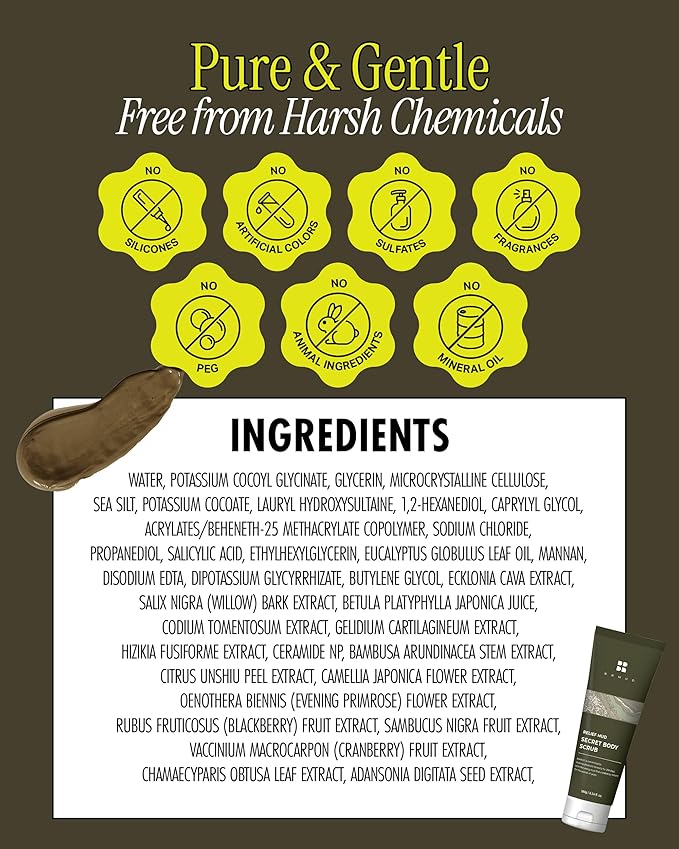 - SKIN-PURIFYING MUD COMPOSITION. Embrace silky smooth skin with BRMUD Relief Mud Secret Body Exfoliating Scrub! Featuring 10,000ppm Boryeong Mud, finely-milled with advanced nano-technology, it eliminates sebum and blackheads while moisturizing and revitalizing your skin. Enjoy clear, vibrant, and balanced skin with every use!