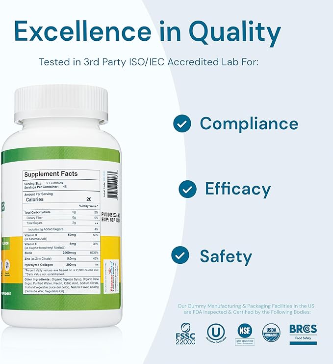 - Premium Quality Ingredients: Each gummy serving is packed with 200mg of hydrolyzed collagen, 2500mcg of biotin, 5mg of zinc, and vitamins C & E, carefully selected to support your overall health.*