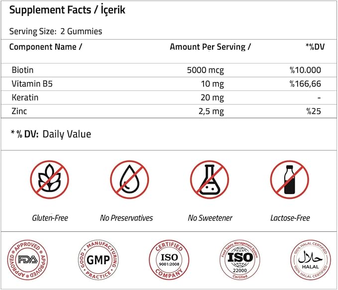 - Supports Healthy Hair Growth: Packed with 5000mcg of Biotin, our gummies help promote thicker, fuller hair and reduce breakage for gorgeous locks.