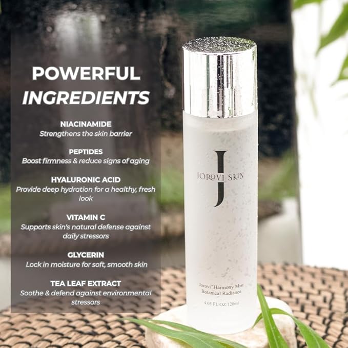 - Face Toner - Harmony Mist Botanical Radiance: Formulated with Niacinamide and Vitamin C, this facial toner boosts radiance, tightens pores, and deeply hydrates. It smooths skin texture and shields against environmental stress for a refreshed, healthy glow