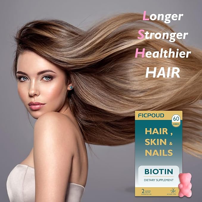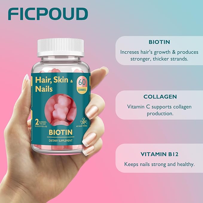 - ALL IN ONE SOLUTION: FICPOUD Biotin Gummies come with a blend of ingredients that for healthier hair, stronger nails, and promote smooth and firm skin.Containing with Vitamins E & C, they provide essential antioxidants, fatty acids, and nutrients that your hair, skin, and nails need to thrive. Our formula boosts your body's natural collagen production, allowing you to feel confident and radiant from the inside out.