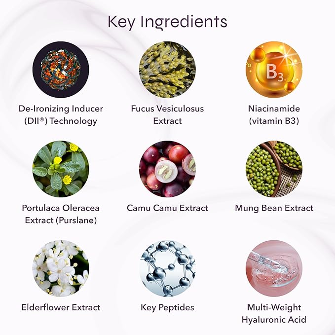 - Active Ingredients : Niacinamide (vitamin B3), De-Ironizing Inducer (DII®) Technology, Fucus Vesiculosus Extract