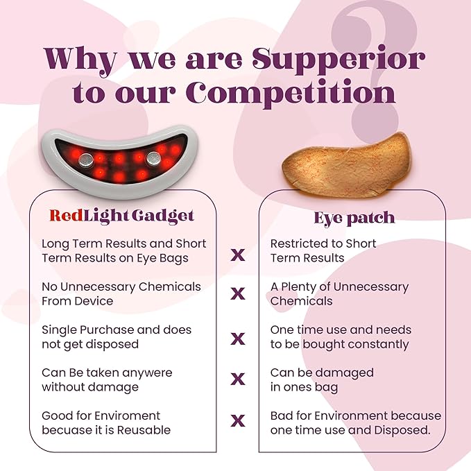 • No Long List of Chemicals Other Eye Bag Products Use an Extensive List of Chemicals. With Our Red Light Therapy Gadget There are No Chemicals Coming Out of the Device.