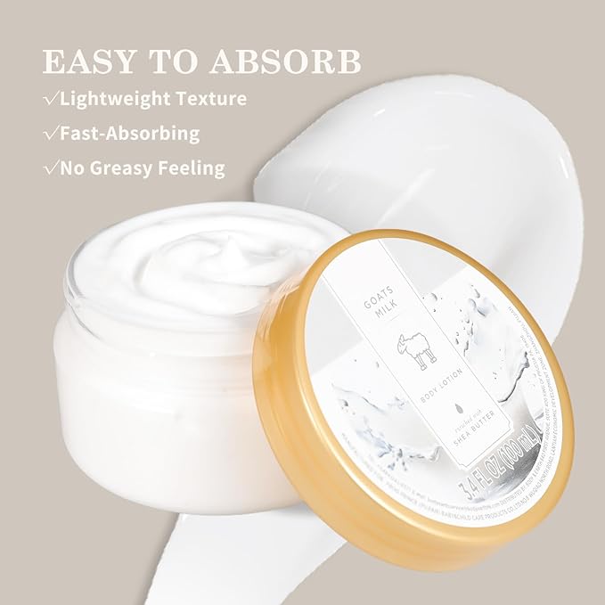 - EASY TO ABSORB: The Goat Milk Body Lotion has a fast absorbing, non greasy formula that can be quickly absorbed into the skin without leaving any greasy or viscous residues, providing hydration for a whole day. Let you enjoy the convenience of body lotion without leaving any greasy feeling.