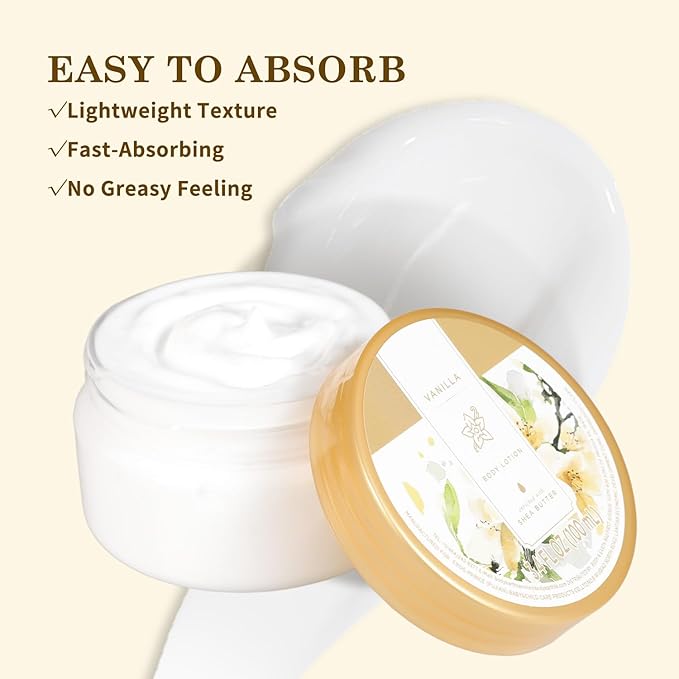 - EASY TO ABSORB: The Vanilla Body Lotion has a fast absorbing, non greasy formula that can be quickly absorbed into the skin without leaving any greasy or viscous residues, providing hydration for a whole day. Let you enjoy the convenience of body lotion without leaving any greasy feeling.