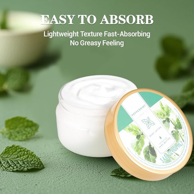 - EASY TO ABSORB: The Peppermint Body Lotion has a fast absorbing, non greasy formula that can be quickly absorbed into the skin without leaving any greasy or viscous residues, providing hydration for a whole day. Let you enjoy the convenience of body lotion without leaving any greasy feeling.
