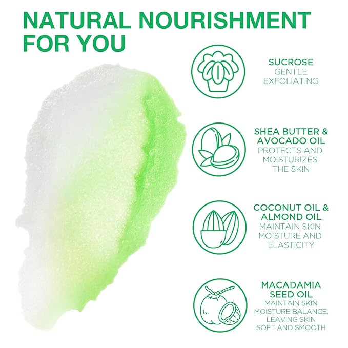 - NATURAL NOURISHMENT: Our Coconut Body Scrub is enriched with natural nutrients such as Shea Butter, Coconut Oil and Vitamin E, which can effectively penetrate the skin, remove impurities, deeply nourish, leaving skin burden-free, soft, smooth and youthful.