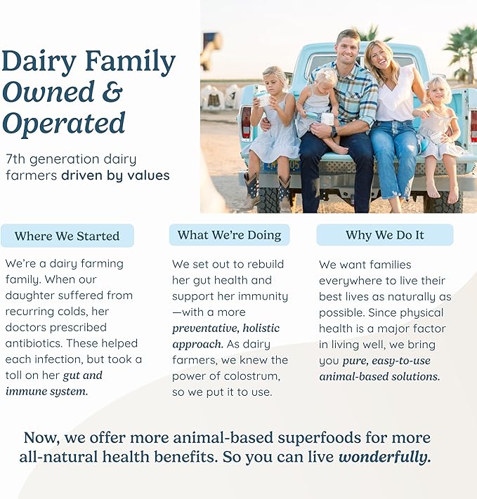 - The WonderCow Promise: We source our bovine colostrum + bone collagen from sustainable, reputable farms that use ethical and humane farming practices. Our product contains no artificial ingredients, sweeteners, dyes, additives, or fillers - just pure, high-quality colostrum + collagen powder. Additionally, we follow our Calf-First Promise, ensuring that the newborn calves receive the colostrum they need before we collect any excess. This means that our colostrum is not only effective, but also s
