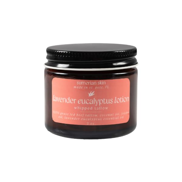 100% Grass Fed & Organic Whipped Beef Tallow Lotion - All Natural - Body + Face Mosturizer for All Skin Types (2 Ounce, Lavender Eucalyptus)