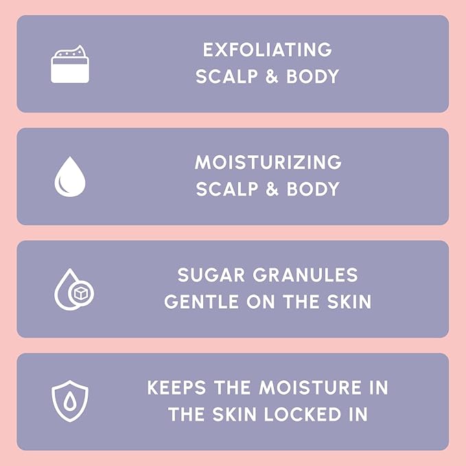 - SUGAR SCRUB FOR BODY – Made with sugar crystals to provide a gentle exfoliation to the skin and scalp. Sugar granules are gentler on the skin and can cleanse and clear skin from dirt.