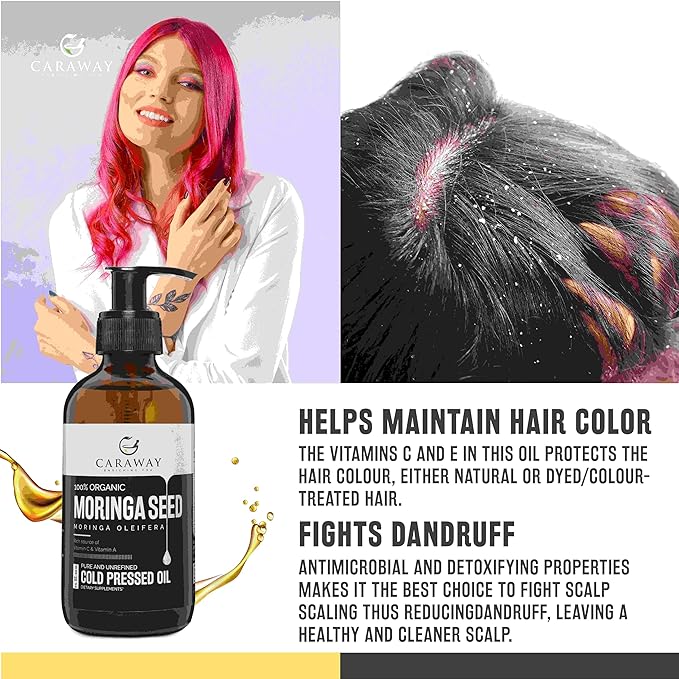 • BENEFITS FOR HAIR- Natural properties found in moringa oil fights the scalp infection, moisturizes the hair follicles. Thus treat dandruff naturally. Anti-oxidants present fight outside environmental damage which is responsible for greying of the hair and hair color loss. People dying or coloring their hair can benefit from this oil.