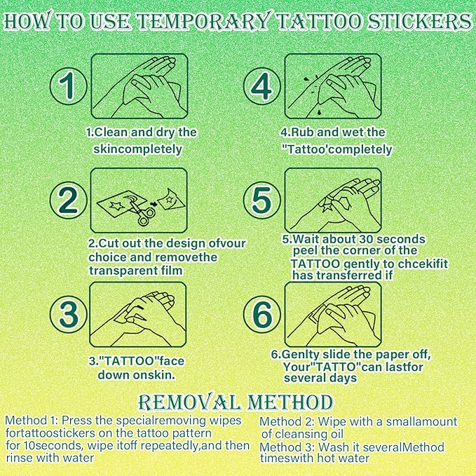 - 【WATERPROOF&LASTING】:Our temporary tattoos made from green materials,waterproof, non-toxic and non-allergic.You can stick it on the arms, hands, fingers, legs, feet, collarbone,neck,chest.Whether they're playing in the pool or running around at the park,These tattoos will stay the same.