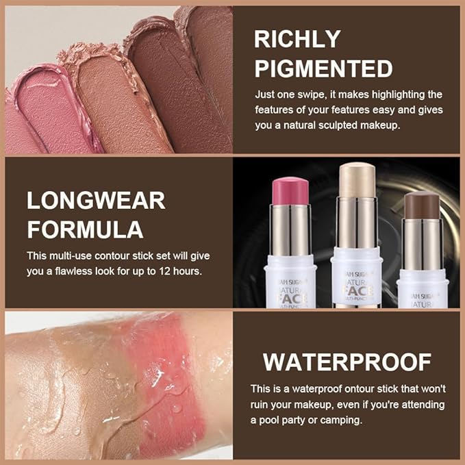 - MOST POPULAR FACE MAKEUP —— We conducted detailed market research based on a variety of factors such as skin tone and age, and selected from a wide range of colour combinations to create a combination of Contouring Stick for Fair, Light, Medium, Deep skin tones. This trio of face contour stick set is also suitable for women of different age groups at the same time.