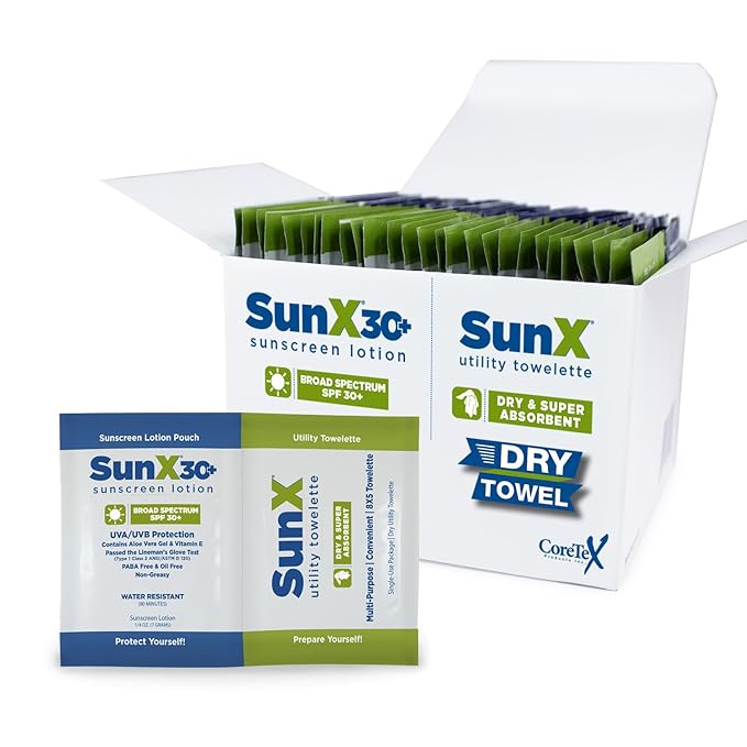- CONVENIENT DRY TOWELS INCLUDED - Each Sun X Sunscreen Lotion Packet is paired with a DRY towelette, guaranteeing a mess-free sunscreen application